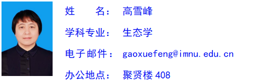 高雪峰,女,汉族,博士,副教授,学术研究生导师。研究方向微生物生态和土壤生态学。先后主持国家自然科学基金1项,内蒙古自然科学基金2项以及地厅级项目3项。出版研究专著1部,发表科研论文20余篇,教学研究论文2篇。2005年(第五届)和2015年(第九届)获十大买球投注网站中青年教师教学技能大赛三等奖。2012年和2021年获十大买球投注网站教学成果二等奖。先后承担本科生的土壤学、土壤学实验、恢复生态学、城市生态学、保护生物学、植物形态解解剖学、普通生态学实验、无机化学实验等课程的教学工作。并承担本科生的社会调查和应用生态学实习指导工作。承担研究生的土壤生态学、恢复生态学研究进展、可持续生态学(城市与可持续发展部分)和高级生态学(微生物生态学部分)课程的教学工作。