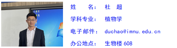 杜超,男,汉族,群众,博士,讲师,硕士研究生导师,生物技术系副主任,主要研究方向为植物逆境生理及分子生物学。主持内蒙古自然科学基金项目2项,内蒙古自治区直属高校基本科研业务费项目1项;参与国家自然科学基金项目3项,内蒙古自然科学基金项目2项。发表学术论文13篇、专利1项,获十大买球投注网站青年教师教学技能大赛一等奖、内蒙古自治区高等院校青年教师教学技能比赛一等奖。承担普通生物学、种子植物分类学、植物学实验、植物学实习、生物分类学实习、植物生物学、科学伦理、学术诚信和学术规范等本科生及研究生课程。
