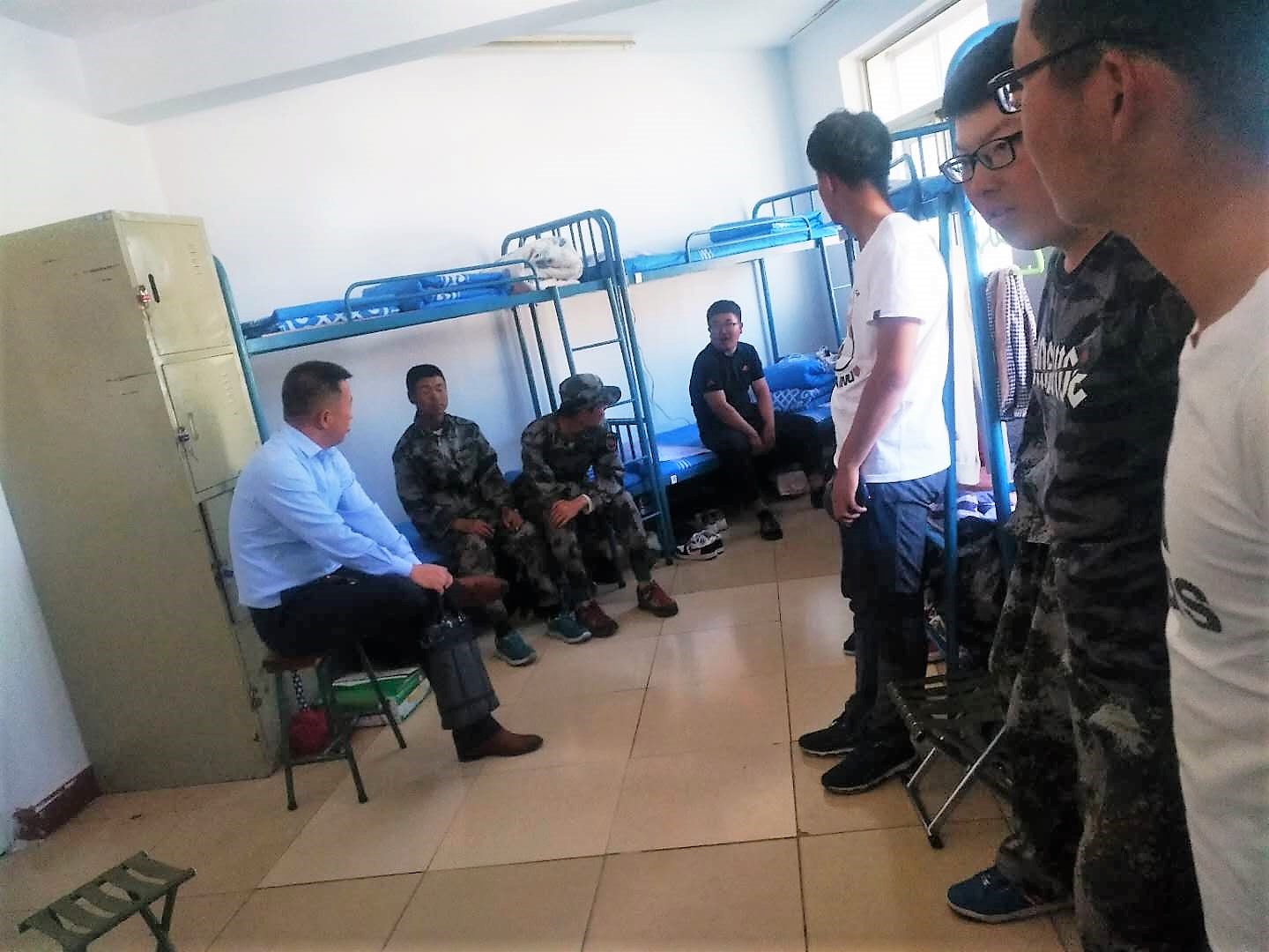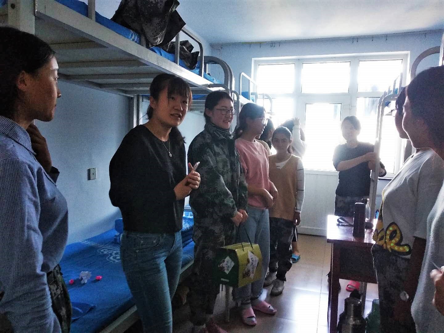 刘老师与支部志愿者王凯波,组织委员鲁明杨与刘晓静,宣传委员赵甜与孙婧分为三组分别走入男生415、女生510、511室看望大家,党员老师及学姐的到来,受到了大家的热烈欢迎。