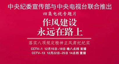 电视专题片《作风建设永远在路上——落实中央八项规定精神正风肃纪纪实》是由中央纪委宣传部、中央电视台联合摄制的,已于2014年12月15日至18日在中央电视台播出,至今仍在网上引起大量关注,学院网党建工作现将此片链接发布,请师生党员业余时间链接观看。