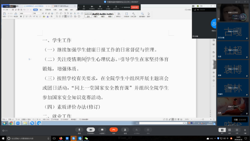 最后,由学院党委书记徐忞做总结。他强调,就业工作任重而道远,全院学工老师要在现有工作基础上,充分认识新冠肺炎疫情期间做好毕业、就业、创业工作的重要性和紧迫性,牢固树立“一盘棋”意识,提高政治站位,明确责任分工,以高度的责任感、紧迫感和使命感,通力合作,精准施策、扎实做好、做实、做细各项学生工作。红雨、王铁娟两位老师还就2017级师范生实习、实训等相关问题进行了解答。