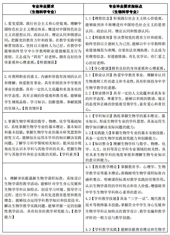目标4:熟悉生物学学科发展趋势,形成专业发展意识,树立终身学习理念,进行学习和专业发展规划;了解国外生物学教育改革发展的趋势和动态,能够借鉴国际先进教育理念进行教育教学;具有一定的创新意识,能够运用批判性思维方法分析和解决教育教学问题;能够开展合作教研,持续提升教学能力和水平。