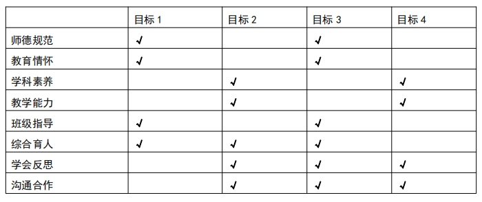 目标1:热爱祖国,拥护中国共产党的领导,践行社会主义核心价值观;热爱教育事业,贯彻党的教育方针,始终坚持立德树人;遵守教师职业道德规范,具有依法执教意识,有强烈的社会责任感和事业心,尊重学生人格,关爱学生,成为学生锤炼品格、学习知识、创新思维和奉献祖国的引路人。