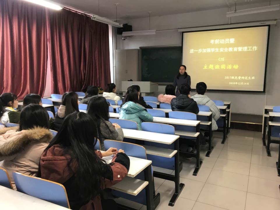 按照学校要求,根据体育买球官网《关于组织开展考前动员大会暨进一步加强学生安全教育与管理工作的通知》文件精神,为进一步加强院风、学风建设,维护学院正常的教学和生活秩序,保障学生的人身、财产安全和身心健康,2018年12月13—17日期间,体育买球官网各班以主题班会或团日活动的形式举行了“考前动员大会暨进一步加强学生安全教育与管理工作”的主题活动。