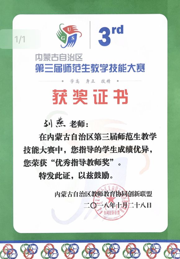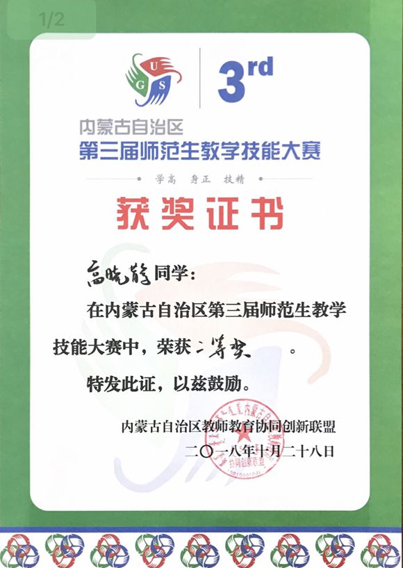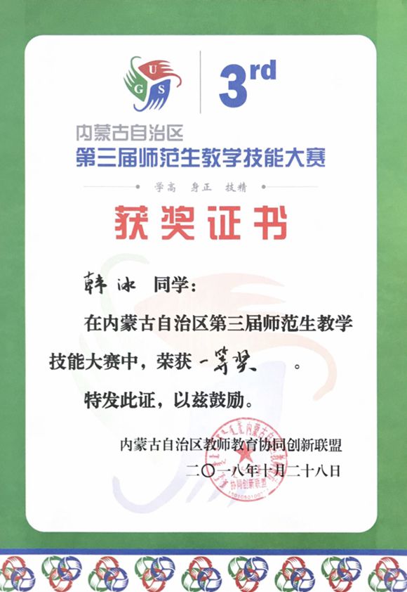 2018年10月27~28日,内蒙古自治区第三届师范生教学技能大赛在我校成功举办,来自十大买球投注网站、内蒙古民族大学、包头师范学院、集宁师范学院、赤峰学院、呼和浩特民族学院、河套学院七所高校的师范生参加了此次比赛。与前两届比赛不同,本次竞赛除面试环节外,新增了笔试部分。经过赛前的艰苦训练和两天激烈的现场角逐,体育买球官网2015级生物科学汉班韩冰、高晓鹊同学脱颖而出,分别获得大赛一等奖和二等奖,刘燕老师荣获优秀指导教师。