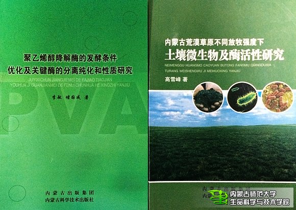 近日,体育买球官网青年教师高雪峰的专著《内蒙古荒漠草原不同放牧强度下土壤微生物及酶活性研究》和李敏的专著《聚乙烯醇降解酶的发酵条件优化及关键酶的分离纯化和性质研究》由内蒙古出版集团内蒙古科学技术出版社正式出版。