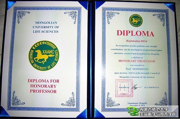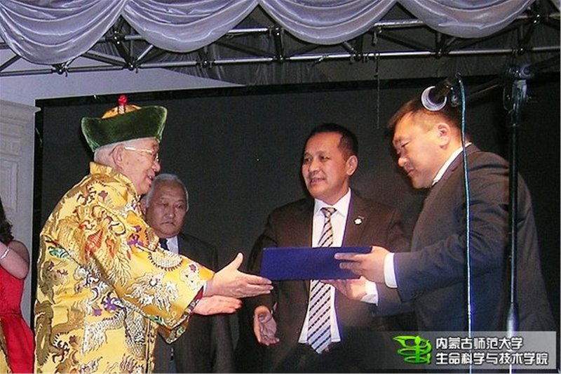 11月28日,蒙古国国立农业大学在乌兰巴托巴彦高勒饭店举行荣誉教授授予仪式,授予著名昆虫学家、我校能乃扎布昆虫研究中心主任能乃扎布教授“荣誉教授”称号。 蒙古国国立农业大学校长贺如嘎博士亲自将荣誉证书颁发给能乃扎布教授,蒙古国教育科学部部长钢图拉嘎先生亲切接见了能乃扎布教授,有关学者专家出席了荣誉教授授予仪式。 以能乃扎布教授为首的我校科研团队与蒙古国国立农业大学、蒙古国科学院植物保护研究所等科研院所长期合作开展了蒙古高原生物多样性、草原保护以及森林病虫害等领域的科学研究和学术交流,取得了丰硕的成果,同时,能乃扎布教授还对蒙古国科学院和我国科学院在相关领域的合作研究做出了杰出的贡献。