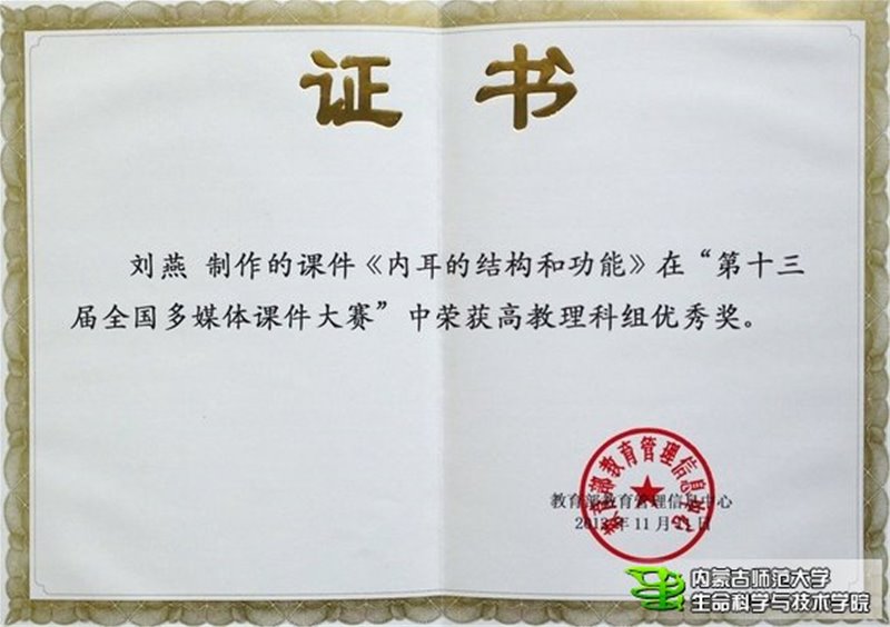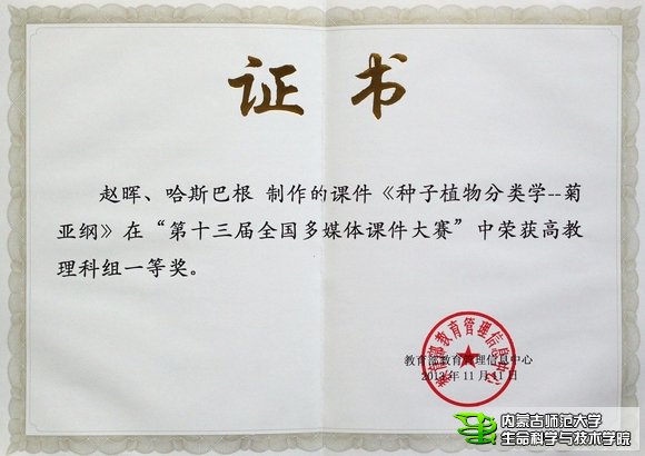 经过初审和复审,高教理科组共有69个课件入围决赛。体育买球官网教师赵晖和哈斯巴根老师参赛课件《种子植物分类学—菊亚纲》入围决赛。在北京现场决赛阶段,参赛者首先进行5分钟的课件演示和讲解,然后回答专家提出的问题,专家现场打分并现场公布决赛成绩。经过激烈角逐,《种子植物分类学—菊亚纲》课件现场得分87.75,喜获一等奖。据悉,本次大赛理科组共产生了10个一等奖、22个二等奖、37个三等奖。另外,体育买球官网教师刘燕的参赛课件《内耳的结构和功能》荣获优秀奖。