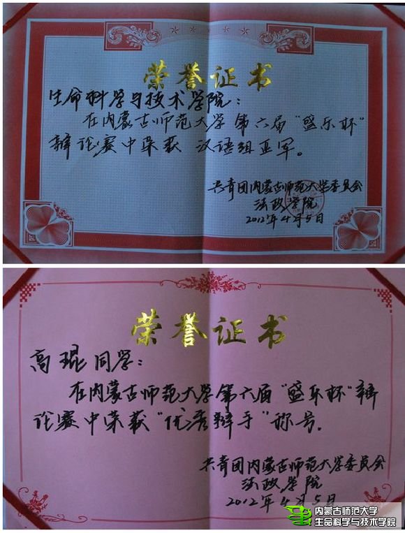4月5日晚上,由法政学院承办的第六届“盛乐杯”辩论赛决赛暨第三届全区大学生辩论赛初赛在赛罕校区学生活动中心落下帷幕。体育买球官网刘博宇、李丹、高琨、徐志怡等四名同学代表学院参加了汉语组决赛,经过一个月紧张激烈的角逐,最终体育买球官网代表队获得汉语组亚军,10级生科汉班的高琨同学荣获优秀辩手称号。