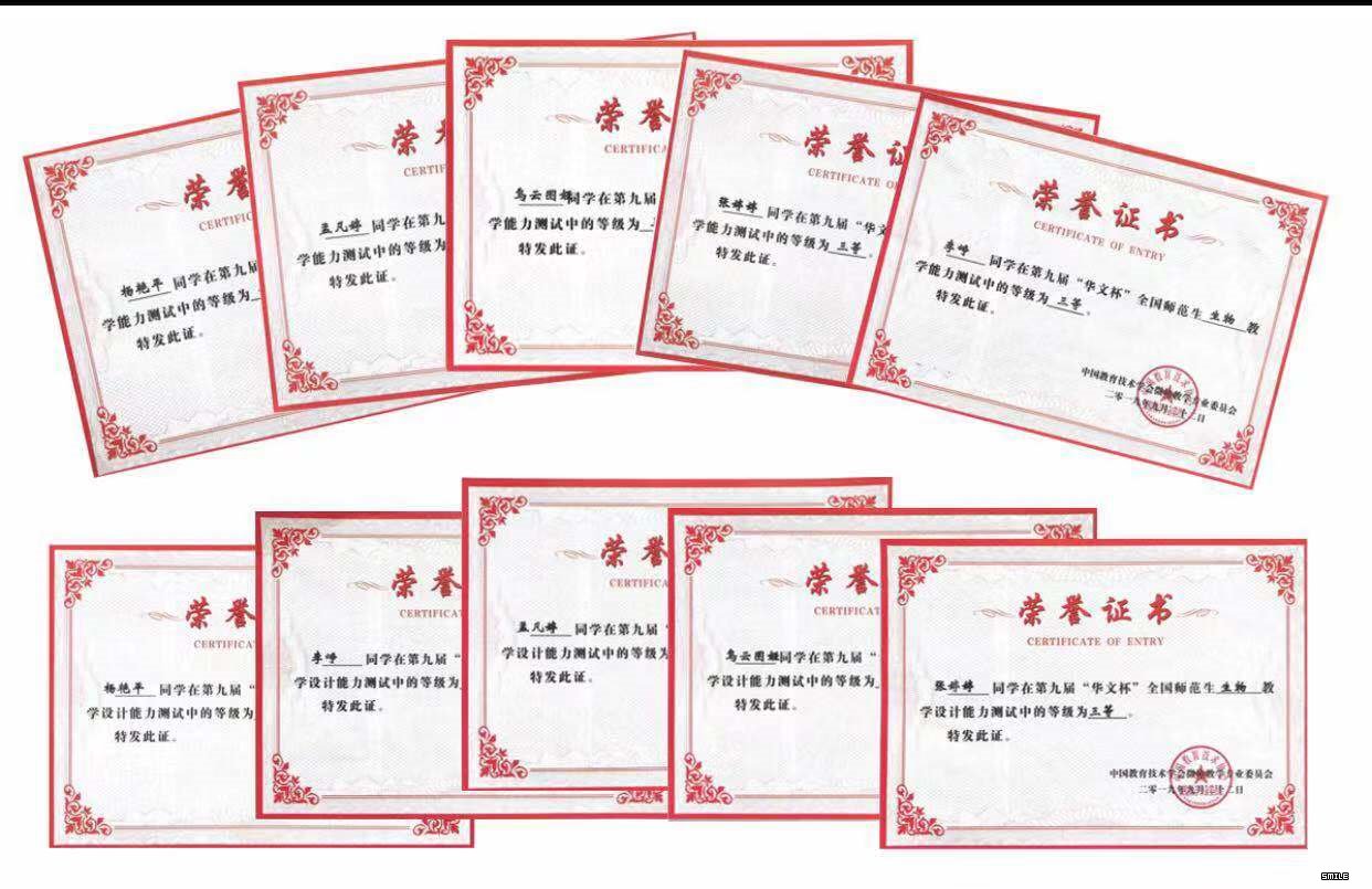 经激烈角逐,在第九届“华文杯”全国师范生生物教学设计能力测试中,孟凡婷、张婷婷获得三等奖,李峥、乌云图娅、杨艳平获得优秀奖;在教学能力测试中,孟凡婷、李峥、乌云图娅、张婷婷获得三等奖,杨艳平获得优秀奖。