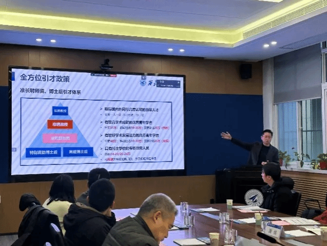尚学群从发展历程、师资队伍、学科特色、科研平台和国际合作等方面介绍了学院的整体情况,并详细解读了学院的人才引育政策,特别就海外优青、翱翔海外青年等人才项目申报进行了重点介绍,并鼓励各位学者积极依托学院申报项目。