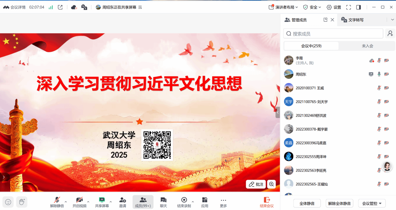在谈到文化及文化多样性时,周教授引用习近平总书记在多个国际场合的讲话,指出文化多样性是人类社会的基本特征,是世界文明交流互鉴的基础。中国文化从不拒斥异质文化,而是在包容中发展、在融合中创新。我们要在坚持文化主体性的基础上,推动文明互鉴、共建人类命运共同体。