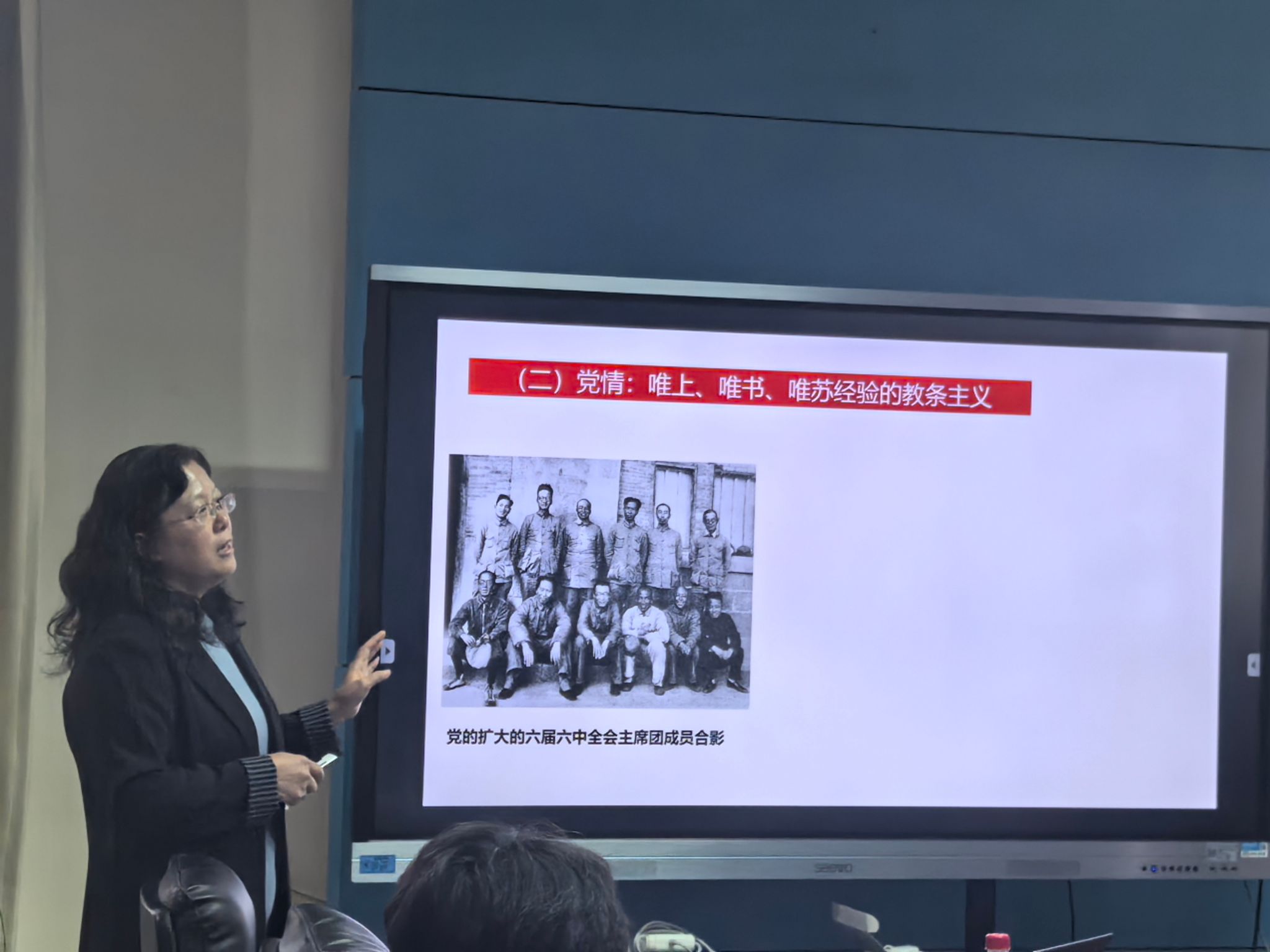 课上,高旭红老师以《改造我们的学习》的创作背景为切入点,系统梳理了全面抗战爆发后,中国面临的复杂世情国情,以及党内教条主义、主观主义等问题对革命事业的影响。通过详实的历史数据与生动案例,主讲人深入解读了毛泽东同志撰写该报告的核心缘起,阐明了”改造学习”是应对时代挑战、破解革命难题的必然选择。