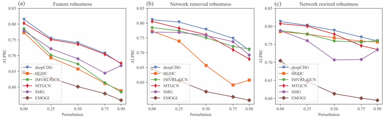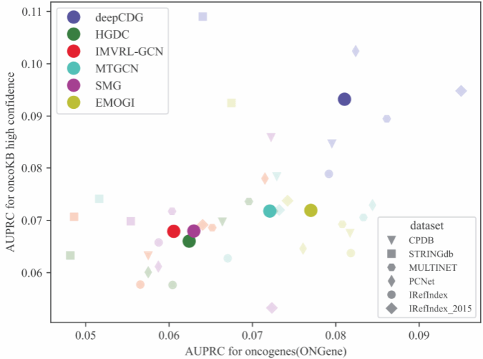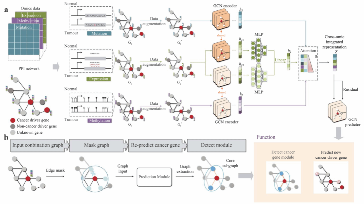 癌症驱动基因在理解癌症的发生、发展和治疗发现中起着关键作用,大量的多组学数据和生物网络的积累为基于图神经网络预测癌症驱动基因提供了数据基础。该研究提出了一种基于深度图卷积网络(GCN)的多组学整合模型deepCDG,其任务为图节点分类学习,用于癌症驱动基因识别。模型输入是由蛋白质互作网络分别与基因组、转录组和表观基因组等组学信息构成的图,该图以基因为节点,以蛋白质互作关系为节点的连边,分别将基因表达信息、甲基化信息和突变信息分配到各个基因作为节点特征。模型使用共享参数的 GCN 编码器从三个组学视角提取基因表征信息,然后通过注意力机制进行表征融合,最后利用残差连接的GCN预测器输出每个基因预测为癌症驱动基因的概率。此外,deepCDG利用GNNExplainer可解释工具进行癌症驱动基因模块挖掘,通过掩码方法识别对于关键癌症驱动基因预测结果最具影响力的子图结构和节点特征。实验结果显示出deepCDG出色的预测性能、鲁棒性、计算高效性和生物可解释性,为解决癌症驱动基因识别问题提供了新思路。