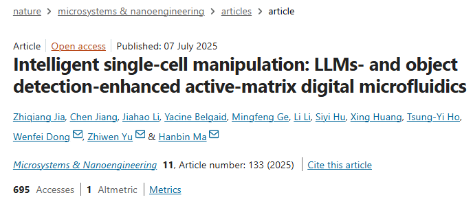 近日,人机物融合智能计算团队最新研究成果“Intelligent single-cell manipulation: LLMs- and object detection-enhanced active-matrix digital microfluidics”被Nature子刊《Microsystems and Nanoengineering》录用并在线发表。米兰milan官方网站人机物融合智能计算创新中心(於志文教授,黄兴教授)、中心共建企业广东奥素液芯微纳科技有限公司(马汉彬研究员)、中国科学院苏州医工所、长春理工大学、香港中文大学等单位共同完成,於志文教授为该论文的共同通讯作者。