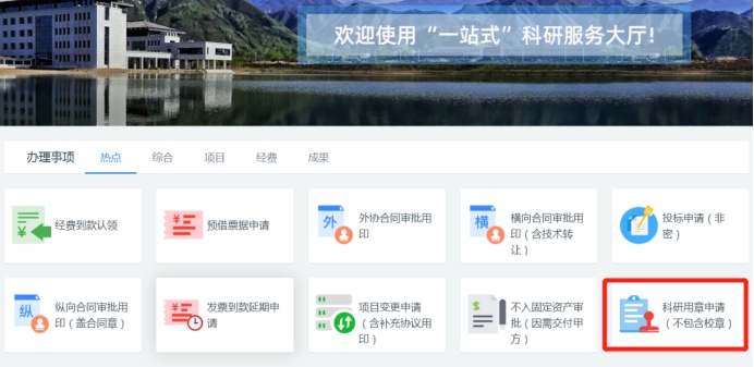 2. 办理地址:登录翱翔门户,点击“科研系统”进入系统首页;在首页办理事项栏选择“科研用章申请”。